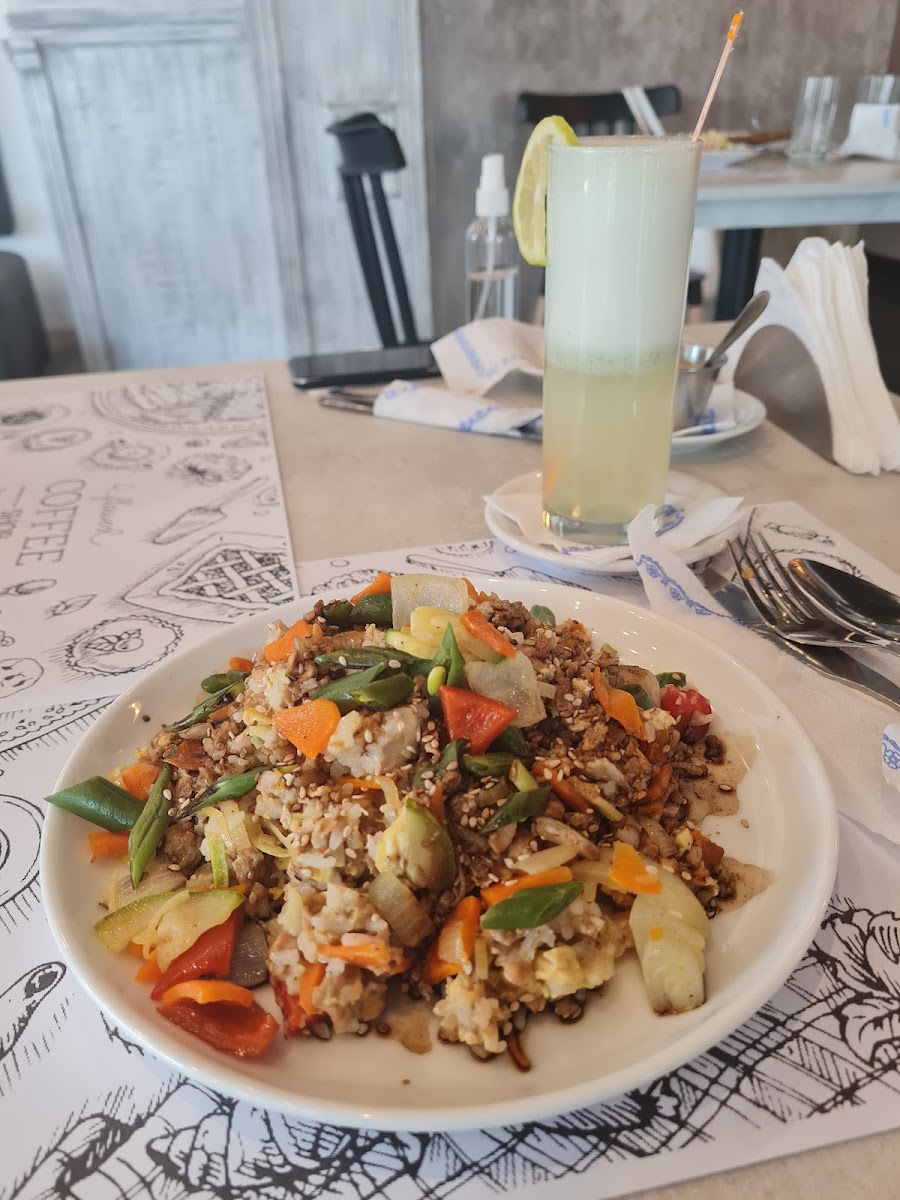 The menu isn’t only about breakfast and sweets, though. Guests looking for something lighter often go for the Wok Vegetariano Con Mix de Semillas. This vegetarian option brings variety to the restaurant’s offerings and adds a fresh, flavorful alternative for diners who want something different from traditional café fare.